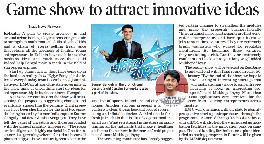 The West Bengal government has tied up with the Indian Institute of Management, Calcutta, to launch a reality show, Egiye Bangla (Forward Bengal), to promote start-ups in the state. The show will be aired on the Zee Bangla channel.